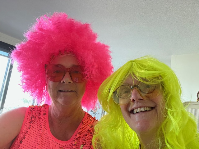 Gro is sinds kort gepensioneerd. Ze rijdt als vrijwilliger bij de sociale vervoersdienst Heen en Weer Amsterdammers die moeilijk ter been zijn. Helen is nog lid van een aantal commissies in de museumwereld. Zij blikt terug: ‘We realiseren ons dat we allebei vaak de wind mee hadden. Op professioneel én persoonlijk gebied. We kwamen elkaar bij toeval tegen en konden twee jaar later voor elkaar kiezen. Na mijn eerste huwelijk van 37 jaar ben ik afgelopen januari opnieuw getrouwd’. Trots laten ze hun trouwring zien. Gro: ‘Op deze leeftijd zijn we samen gelukkiger dan ooit. We genieten van reizen, de (klein) kinderen van Helen en onze vriendenkring. Die hopen we trouwens verder uit te bouwen door te gaan deelnemen aan activiteiten van het Roze Stadsdorp. Bij een feestelijke gelegenheid kunnen we er dan zo uitzien....’