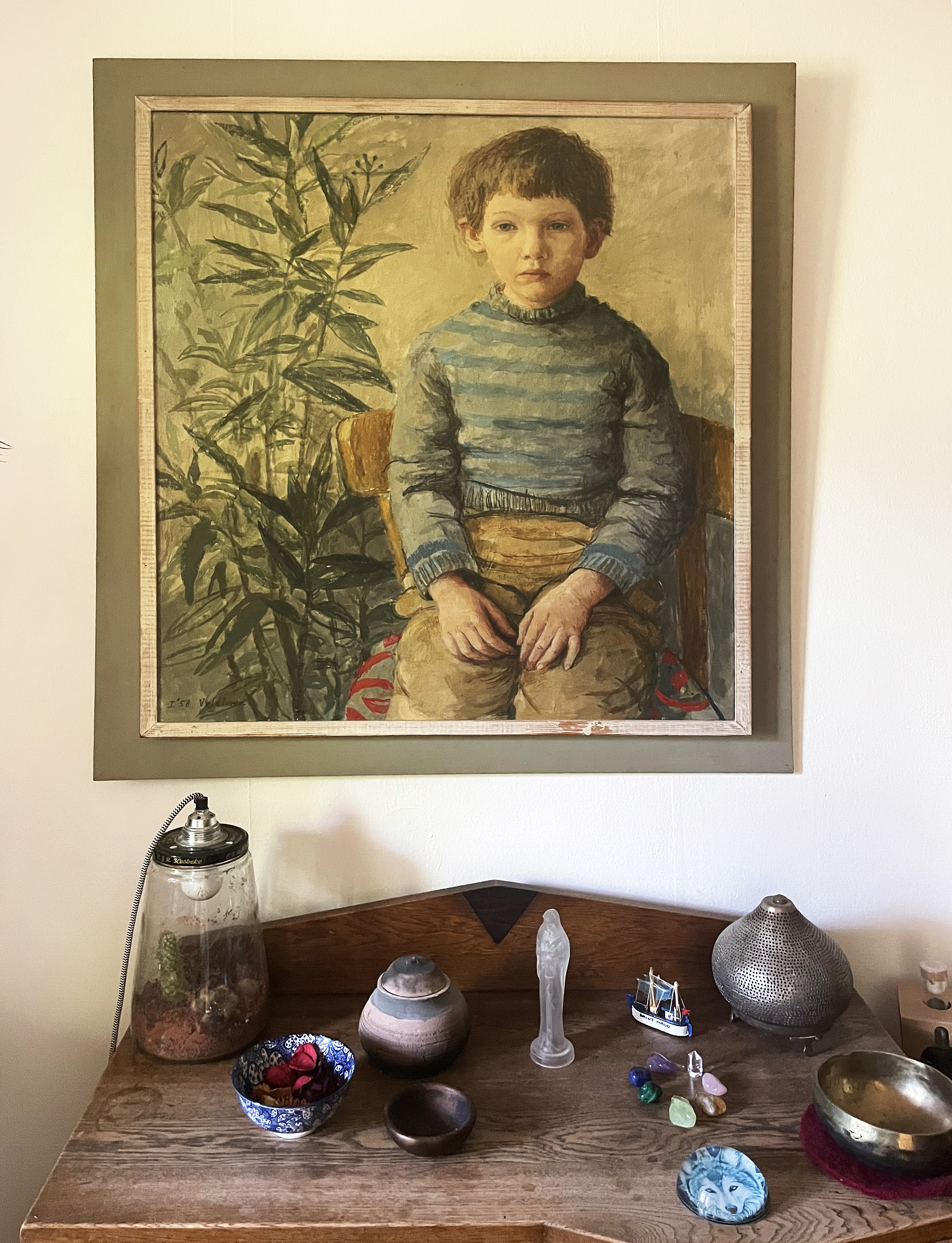 Aan de vertrouwde tafel gezeten kijk ik om me heen. Ik mis iets. Waar is het leuke portret van dat jongetje vraag ik aan Bep. O, zegt ze, dat hangt nu ergens anders. We gaan naar haar werkkamer en bekijken het portret Maar dat is geen jongetje, dat ben ik, vertelt ze. Mijn ouders waren ooit bonusouders van een hele jonge kunstschilder en hij heeft het als dank voor zijn verblijf bij hen geschilderd. Later is hij met zijn werk in een bakfiets de hort op gegaan … en daarna is hij beroemd geworden, vul ik aan. Aat Veldhoen, natuurlijk. Ook ik had in mijn studietijd iets van hem op mijn kamer hangen, maar dat was wel een affiche.