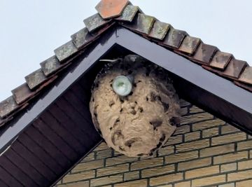 Gisteren is het tweede nest van dit jaar van de Aziatische Hoornaar gevonden. Deze keer niet heel hoog in een boom maar aan een gevel van een huis.