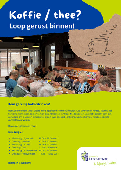 Het koffiemoment vindt plaats in de algemene ruimte van dorpshuis 't Perron in Heeze. Tijdens het koffiemoment staan samenkomen en ontmoeten centraal. Medewerkers van net Sociaal Team zijn aanwezig om je vragen te beantwoorden over bijvoorbeeld zorg, werk, inkomen, relaties, sociale contacten en welzijn.