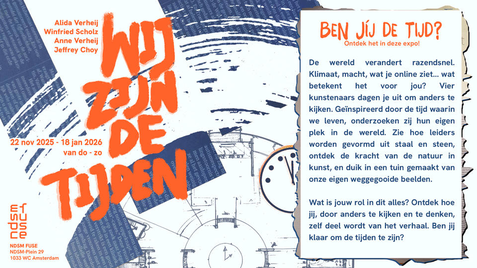 Een Een bijzondere tentoonstelling Wij zijn de tijden. NDSM Fuse, NDSMplein van 22 november 2025 tot 18 januari 2026. Open van maandag tot en met woensdag.