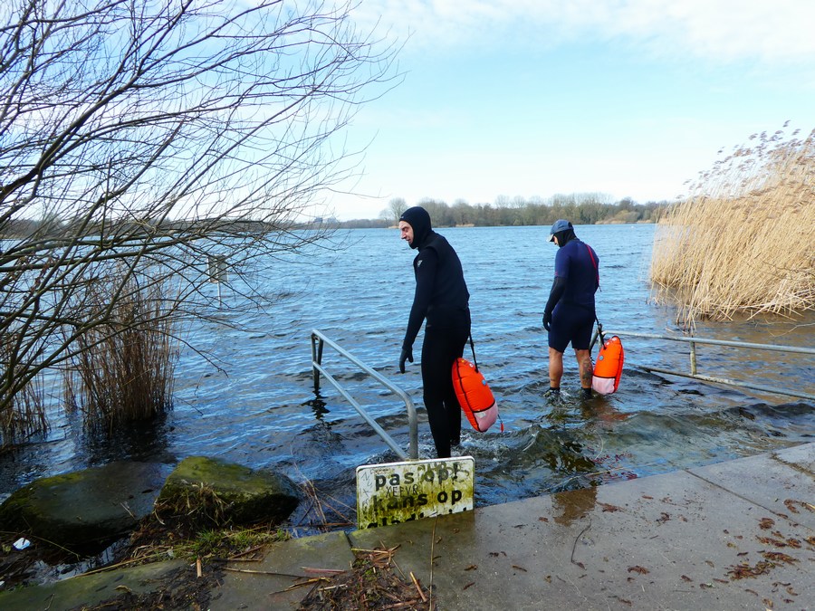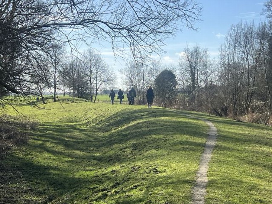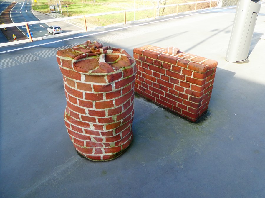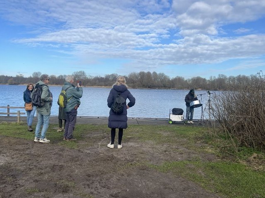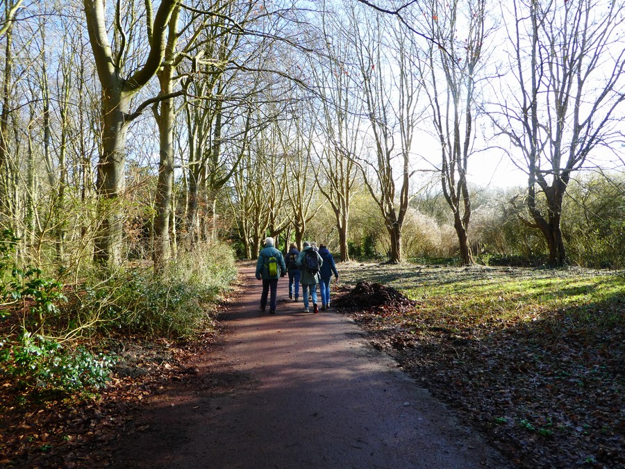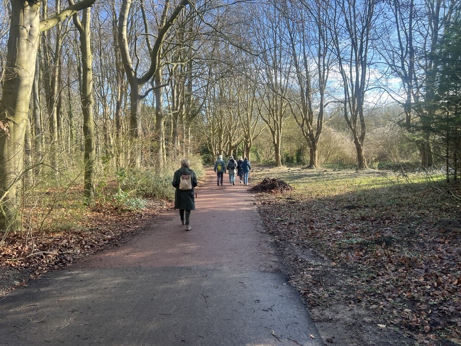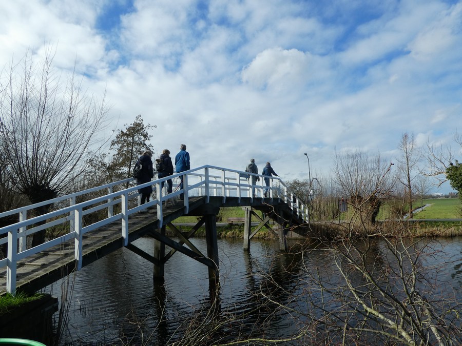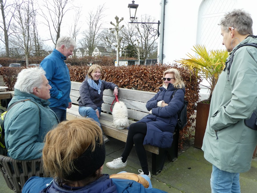 Er scheen een pril lentezonnetje toen zondag 1 maart 2026 om 10 uur zeven wandelaars en een hondje zich voor het CS verzamelden. We namen metro 53 naar eindhalte Gaasperplas, waar een paar van ons meteen de bakstenen koffers en reistassen op het perron herkenden van de vorige keer. We deden deze wandeling namelijk al eens eerder maar dan in omgekeerde richting.
