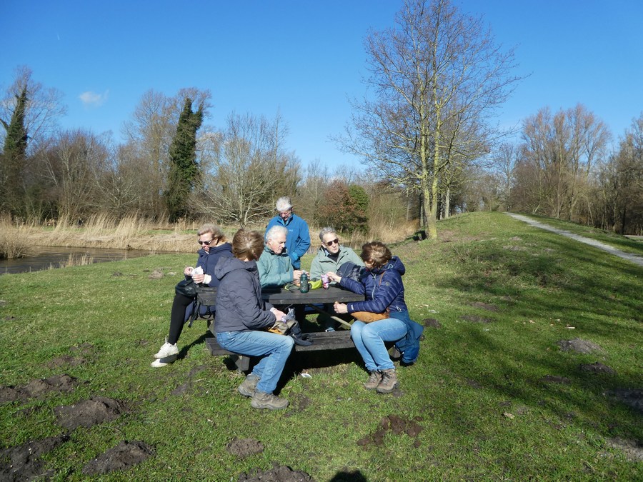 Bij een dijkje aangekomen buigen we linksaf richting het Gein en daar aangekomen rechtsaf richting Abcoude. Maar eerste een welverdiende stop bij uitspanning Anna Haen (‘met inspanning naar uitspanning voor ontspanning’), waar we buiten heerlijk in het zonnetje iets dronken. De bediening liet dit keer een beetje te wensen over (het zal personeelsgebrek zijn), waardoor het allemaal wat langer duurde voordat we de laatste kilometers wandelden.
