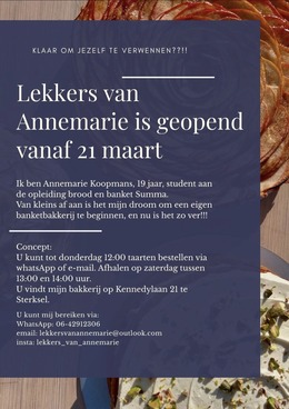 Annemarie Koopmans 19 jaar, student aan de opleiding brood en banket, woont sinds 1 december op Sterksel. Van kleins af aan is het haar droom om een banketbakkerij te beginnen!! De bakkerij is gevestigd op Kennedylaan 21.
