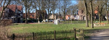 Het bouwperceel ligt tegenover de kerk aan het plein op de hoek van Pastoor Thijssenlaan – Dreef. De makelaar heeft een bord op het perceel geplaatst en de perceelgrenzen zijn met rood gemarkeerde paaltjes afgezet. Zie ook foto.